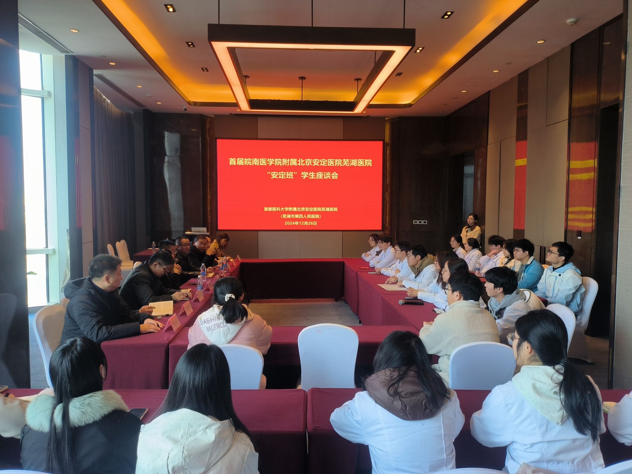 中午,公司联合芜湖市第四人民医院召开“安定班”师生座谈会。公司副经理文育锋,教务处、TapTap点点相关人员,芜湖市第四人民医公司党政领导,北京安定医院芜湖医院派驻院领导参加会议。会议邀请首都医科大学附属北京安定医院经理王刚为同学们答疑解惑。