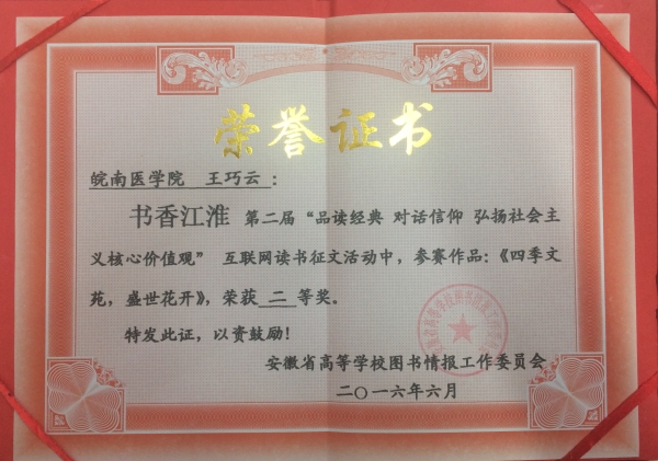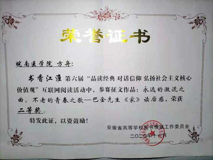 近日,2018级方舟同学的《永远的激流之曲,不老的青春之歌——巴金长篇小说< 家>读后感》荣获第六届“书香江淮”互联网读书征文活动二等奖,这是员工第二党支部第三次在该项赛事中获奖。六年来,支部注重引导广大学子利用业余时间多读书、读好书,让阅读走进老员工的生活,让经典著作引领员工理想信念、树立信仰。广泛动员师生积极参加“读书月”、“书香江淮”互联网阅读等活动。2013级临床医学专业王巧云同学荣获首届、第二届“书香江淮”互联网读书征文活动二等奖。