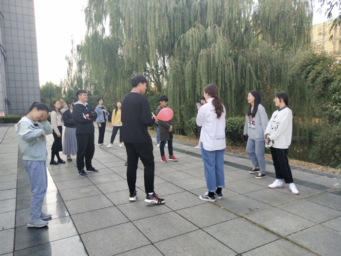 本次素质拓展活动共设“合力吹气球”、“击鼓传花”、“听歌识曲”、“逛三园”、“1块5毛”五个项目。“合力吹气球”项目中,同学们团结协作,合力完成吹气球并挤爆气球。“击鼓传花”项目中,同学们跟着音乐的节奏互传气球,音乐停止时,手持气球的同学作为挑战失败者接受项目预设的“惩罚”。“听歌识曲”项目中,同学们用心聆听,在规定时间内争相作答。“逛三园”项目中,裁判员说出游戏口令,要求参与者轮流说出相应的名称且不能重复。最后的“一块五毛”环节,需要全体成员共同参与,大家手拉手围成圈,。活动现场气氛十分活跃,同学们踊跃参与、齐心协力,同学们在享受游戏的乐趣的同时也收获了诚挚的友谊。