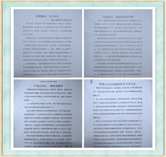 为引导员工全面准确理解临床医学专业认证的相关政策,TapTap点点团委开展了“笔述心声之我与临床专业认证”主题征文活动。活动秉持“多方面,全覆盖”的原则,通过前期线上线下的宣传,同学们踊跃参与投稿,活动共收到作品六十余篇。同学们用朴实无华的文字将自己对专业认证的认识书写成稿,内容紧扣主题,条理清晰,最终,2018级刘文静同学的作品《奋勇前行,我的临床医学梦》获得一等奖,2019级徐欣然等同学的作品《浪潮翻涌,吾心依旧--我与临床专业认证》获得二等奖,2020级林云康等同学的作品《严谨出真知,磨炼显精神》获得三等奖。