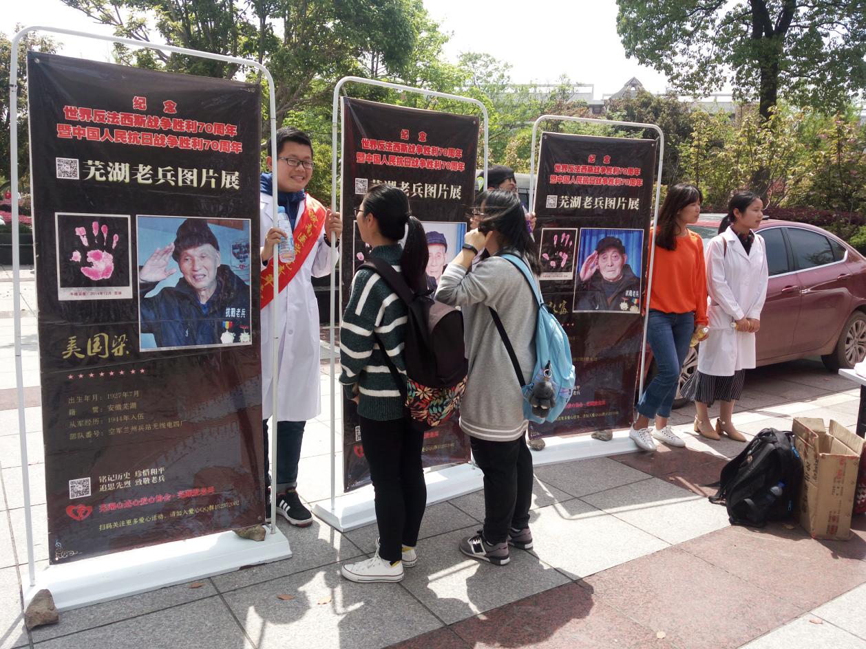 回望当年,长城内外,大江南北,共赴国难。为纪念五四运动98周年,弘扬爱国主义精神,TapTap点点团委携手心连心爱心协会于4月14日在滨江校区老食堂门口成功举办芜湖抗战老兵图片展活动。抗战老兵周耀先、心连心爱心协会会长胡才虎、协会志愿者张琦、康泽应邀出席了本次展览。