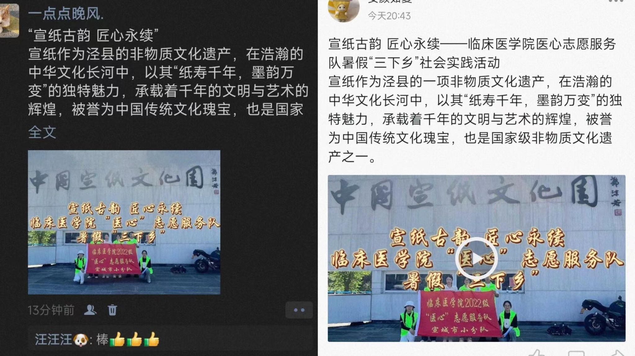 文脉相承,青春蓄力。团队成员们深知宣纸文化宣传的使命与责任,活动结束后,大家通过社交媒体发布了关于此次传承宣纸文化的活动视频。视频展示了宣纸制作的精细过程、与大国工匠毛胜利师傅的交流以及团队成员的感悟。团队成员希望通过这一行动,将宣纸文化带到更广阔的平台,也让更多人了解并关注到这一宝贵的非物质文化遗产。他们以实际行动践行了“文脉相承,青春蓄力”的誓言,为中华文化的传承与发展贡献了青春力量。