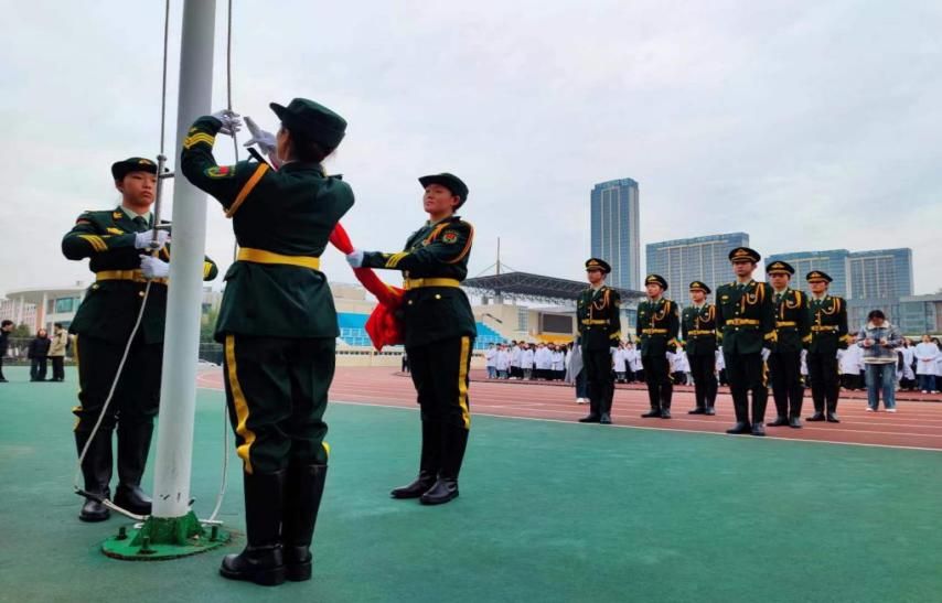 早上7:30,升旗仪式正式开始。伴随着庄严的国歌声,升旗手振臂一挥,鲜艳的五星红旗在晨风中冉冉升起。全体师生肃立,行注目礼,齐唱国歌,向国旗致以最崇高的敬意。这一刻,每个人都被五星红旗的庄重和神圣所感染,心中充满了对祖国的热爱和对新学期的期待。