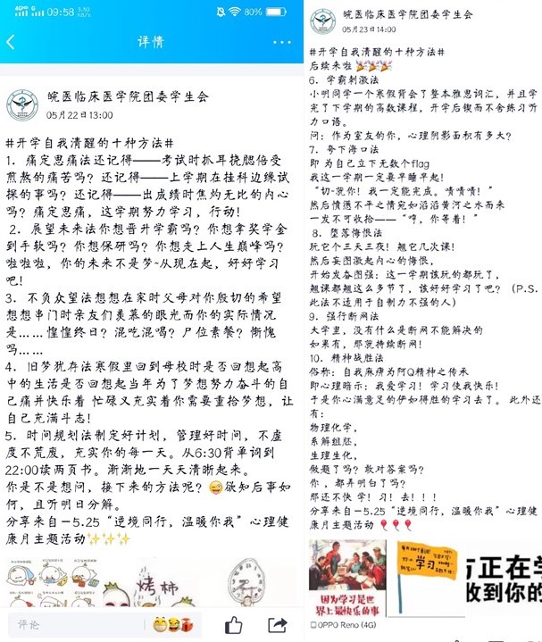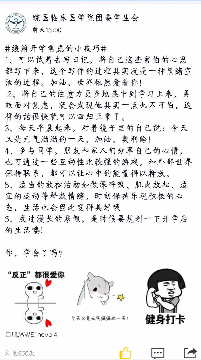 为引导同学们保持良好的心理健康状态,以积极的心态投入复工复学中,公司团委微信公众号和团委员工会官方QQ分期推送有关复工复学后如何防疫和如何保持心理健康的内容。推送内容融科普性和趣味性为一体,将相关漫画趣图和幽默诙谐的词句穿插其中,活泼的卡通形象和生动有趣的图文有效减缓了同学们心中的忧患,字里行间传递的关爱也让广大学子们倍感温暖。同学们在活动期间积极浏览,纷纷留言,表达了自己的看法和感受。