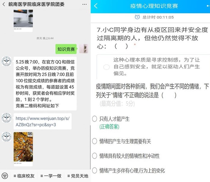 5月25日,公司团委在微信公众号以及官方QQ空间发布防疫知识竞赛参赛链接,组织参赛者于当晚七时整通过链接前往问卷网参赛,进行答题。同学们踊跃参与,本次活动共收到了247份答卷,约百分之九十的试卷顺利通过,并且百分之七十的试卷以优秀分通过。本次活动不仅全方位、多层次帮助大家更加深入学习防疫知识,引导同学们进一步增强安全意识、提高心理健康水平,也为日后的复工复学做好了基础工作。
