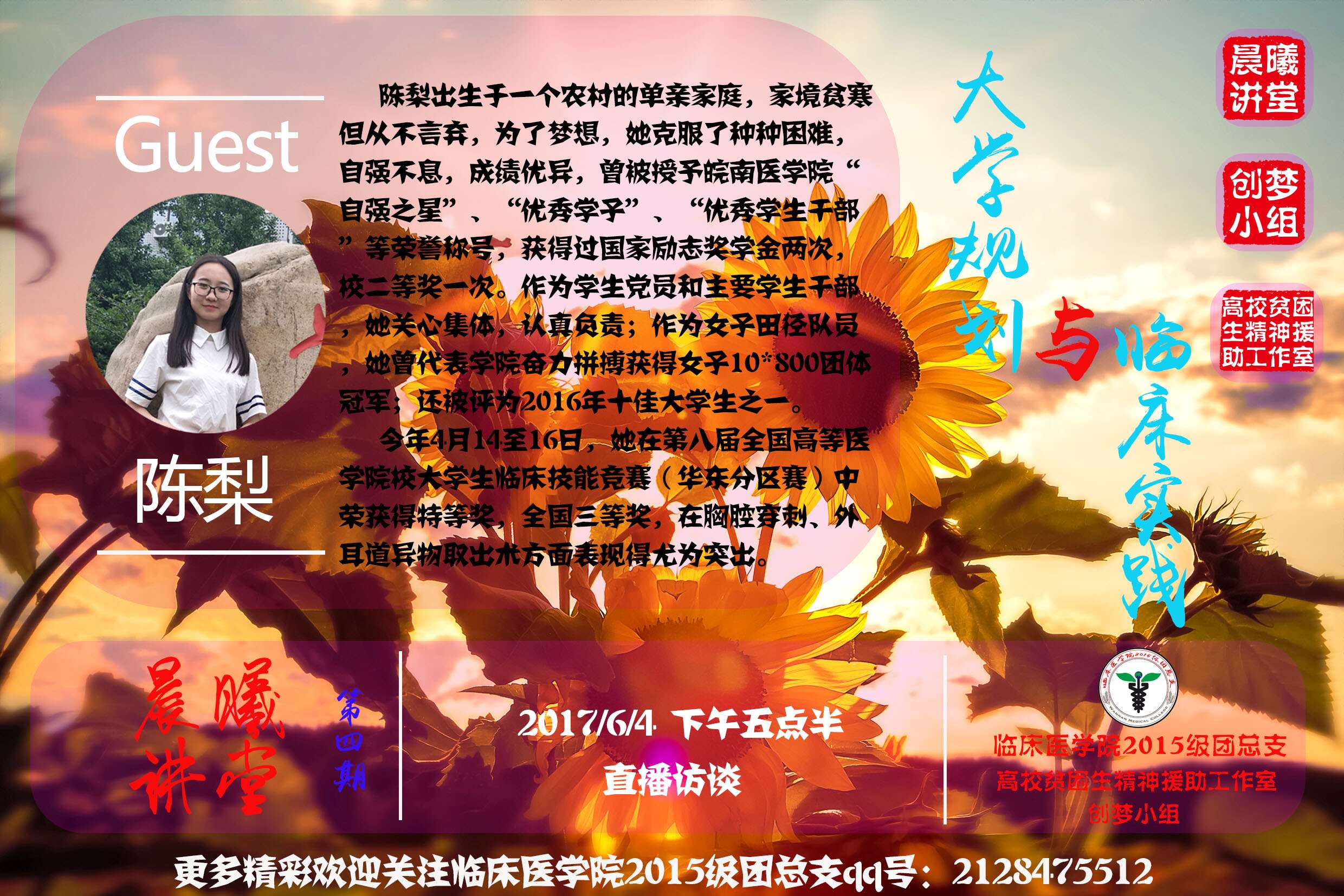 6月4日晚,TapTap点点在3207教室举办了第四期“晨曦讲堂”——大学规划与临床实践。此次活动主讲嘉宾为校“十佳大学生”第八届全国高等医公司校老员工临床技能竞赛总决赛三等奖、获奖选手2012级陈梨同学,TapTap点点“创梦”小组成员参与了现场交流,逾八百人次观看了线上直播。