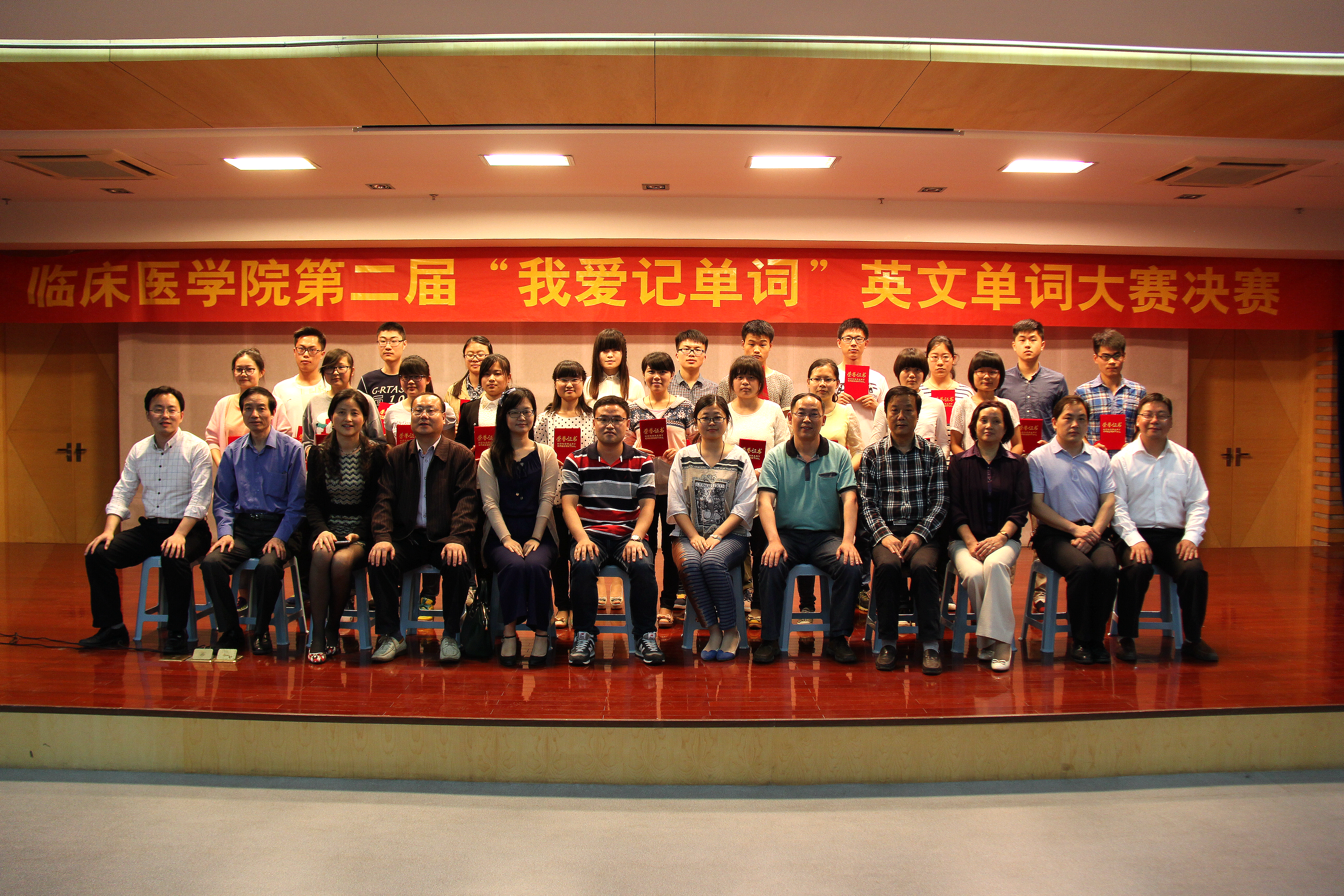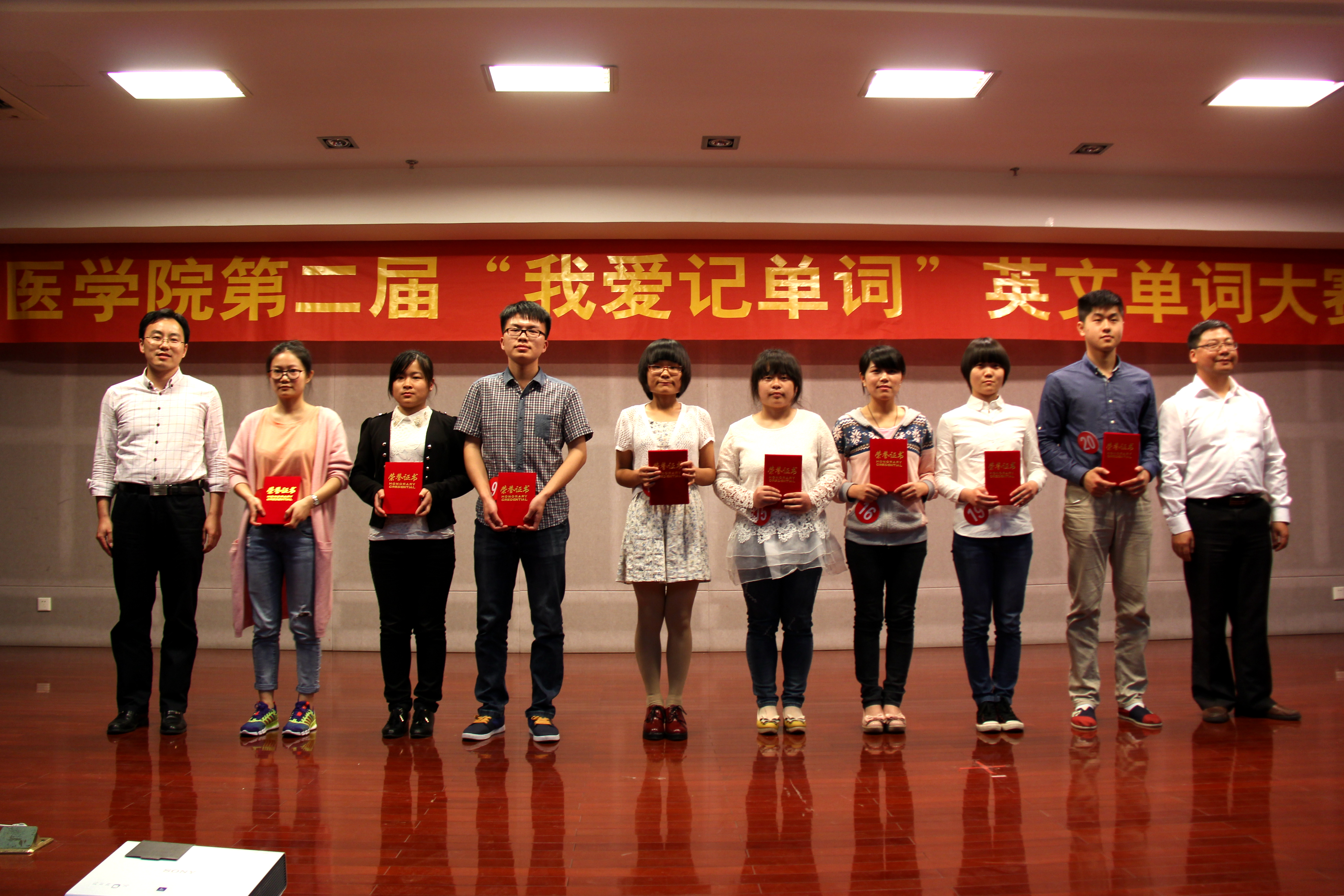 大赛兼具知识性与趣味性,紧张激烈,精彩纷呈。选手们沉着冷静,灵活应变,赢得阵阵掌声。评委点评精彩,不仅对各环节作答关键点进行分析,更与现场同学分享了英语词汇学习的方法和技巧。主持人台风稳健,观众互动热烈,工作人员配合默契,各环节紧密相扣,演员们精心准备的英文才艺展示也在比赛间歇不断将现场气氛推向高潮。经过数次挑战和激烈交锋,共产生一等奖两名、二等奖四名、三等奖六名及优秀奖八名。最终来自临床2014级的蔡飞娜同学和临床2012级的赵禹同学凭借扎实的英文功底、敏捷的思维及稳定的发挥,尽露王者锋芒,喜获本次大赛一等奖。