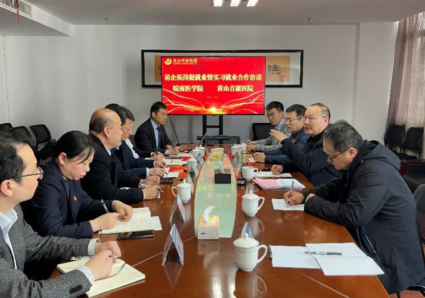 4月1日下午,傅万山等一行五人来到黄山首康医院。座谈会上,黄山首康医院董事长徐建平、经理贾全章、副经理翁延宏对公司人员来访表示热烈欢迎,并就医院团队队伍建设、用人需求进行了介绍,表达了对医学人才的迫切需求。傅万山希望双方在就业和实习等方面进行深度合作,继续推进就业实习一体化建设,为毕业生创造更大发展空间,搭建更好就业平台,拓宽员工就业渠道。公司人员向黄山首康医院推荐本科毕业生66人(其中临床医学36人、康复治疗学3人、医学影像学3人、护理学22人、麻醉学1人、临床药学1人)、研究生10人,并现场将员工简历递交医院医院表示同意录用