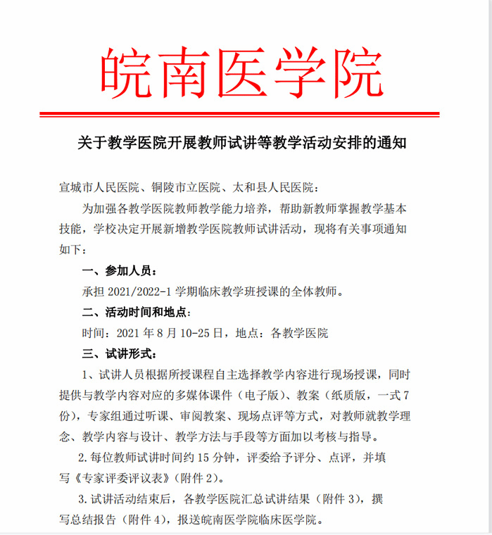 为切实保障新增临床公司新学期的开课和开学工作,同质化推临床教学质量,发挥好各家教学医院协同育人作用;8月10日-25日TapTap点点对附属铜陵医院、附属太和医院和宣城市人民医院开展授课教师试讲督导。为克服疫情影响,采用医院评委线下和公司专家线上督导,覆盖三家临床公司200余名授课教师。邀请教务处副处长余亮、校教学督导组专家、公司党政领导担任评委,教学活动由公司党委副书记、副经理李曙主持。