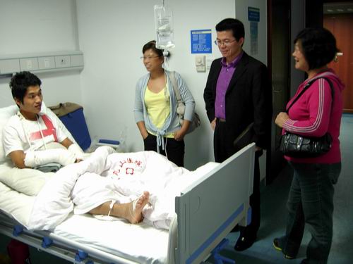 之后,医学一系领导、老师们与朱然父亲及照顾朱然的08级员工们进行了交谈。朱然的父亲非常感激公司老师前来看望,对老师们的关心和慰问表示感谢。