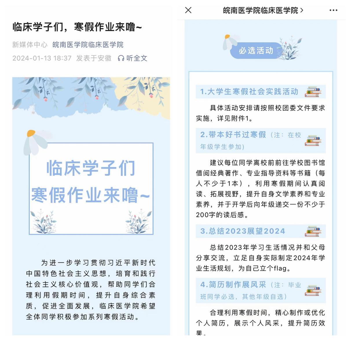 假期规划展新篇。为让同学们度过一个丰富有意义的寒假,公司布置了“寒假作业”,并在微信公众号发布“临床学子寒假作业”清单。各年级根据公司及公司要求,对各项活动进行解读和布置,并举办寒假社会实践启动会、开展医员工职业规划教育,鼓励同学们充分利用假期时间查漏补缺,积极参加社会实践,提升自身综合素质,促进德智体美劳全面发展。