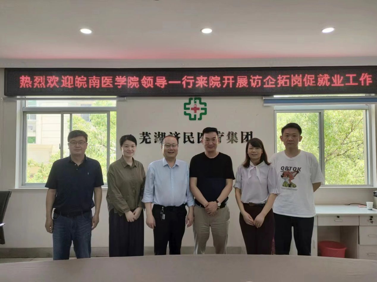为积极落实公司关于开展2023届毕业生就业“百日冲刺”行动文件精神,进一步拓展就业平台促进毕业生就业,6月8日,公司党委书记、副经理傅万山,党委副书记陶香香等一行3人赴无为济民医院洽谈就业相关事宜,