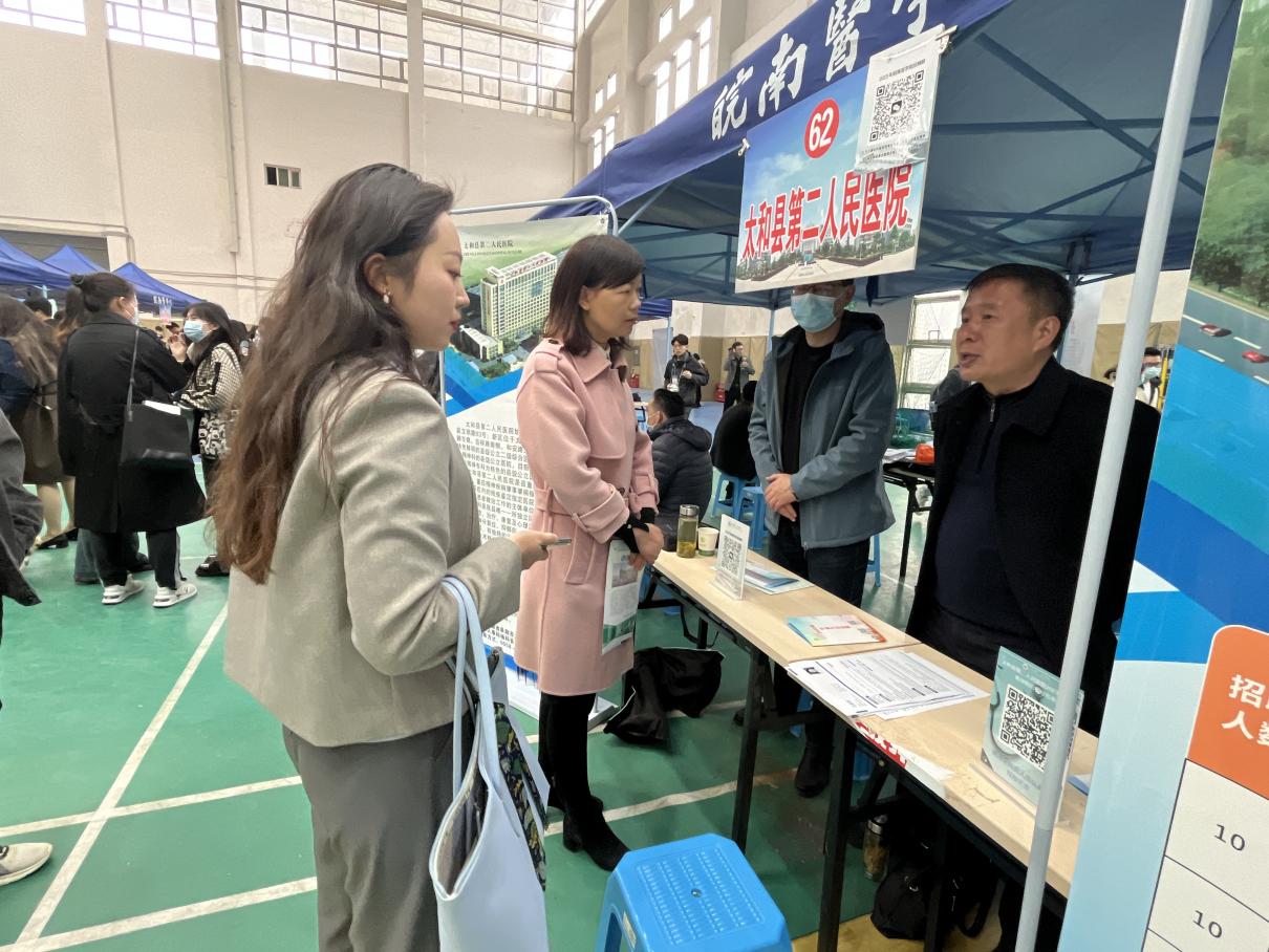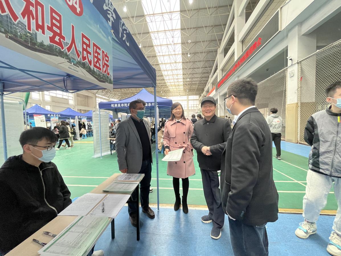 公司党委书记傅万山、副书记陶香香带领毕业班辅导员以及员工工作秘书前往招聘会现场,主动与招聘单位对接开展深入交流,搭建就业平台;为毕业生提供就业指导和咨询服务,动员员工积极报名参加招聘;协助含山县人民医院、太湖县人民医院等医院做好笔试面试准备、后勤保障和考试组织工作。