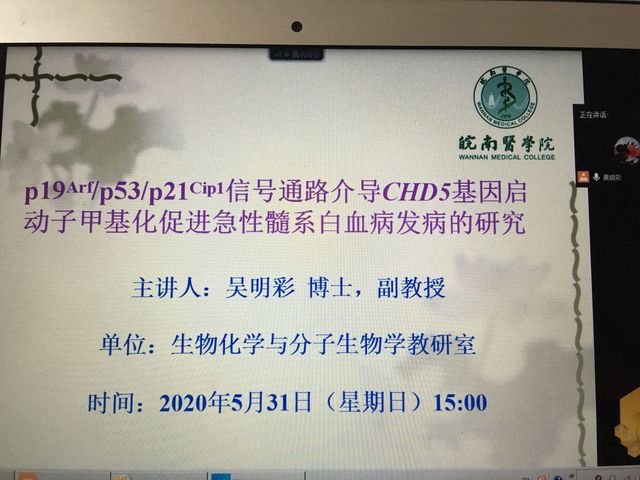 为普及基础医学专业知识,拓展临床学子思维,提升公司员工科研思考能力,丰富疫情期间员工课余生活,5月31日15时,TapTap点点邀请吴明彩博士在线上作题为“p19Arf/p53/p21Cip1信号通路介导CHD5基因启动子甲基化促进急性髓系白血病发病的研究”的讲座。TapTap点点各个年级“大创项目”主持人以及在实验室学习的同学们参加了此次讲座。