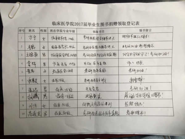 捐赠活动得到了TapTap点点2017届毕业生的广泛响应,大家踊跃捐献出饱含自己浓浓爱心的书籍,尤其是党员带头把陪伴自己度过漫漫考研路的书籍毫无保留地全部捐献出来,毕业生党员苏旭说:“图书捐赠的活动让我们有了一份感情的寄托。能够让自己的书籍流传到学弟学妹的手里,就好像自己在母校的印记能够流传下去一样,这是我们对母校表达感恩之心的一种最好的方式。”本次活动共募捐书籍264本,涵盖各类考研资料,包括西医综合、英语、政治以及医学类相关的专业教材。同时为了更好地帮助学弟学妹们解决在考研中遇到的困惑,本次活动还特地开辟了“考研咨询站”,由已经考取研究生的优秀毕业生来为学弟学妹们解疑答惑。受赠的学弟学妹们通过在便利贴留言的形式表达对2017届学长学姐的感恩和祝福,纷纷表示会以皖医学子的名义将这种“互帮互助、共浴书香”的精神传承下去。